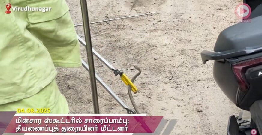 Yesterday evening, when a man from Professor Colony went to pick up his electric scooter, a snake peeked out. Then it went inside the front of the electric scooter and hid. He immediately informed the Virudhunagar Fire and Rescue Services Station.